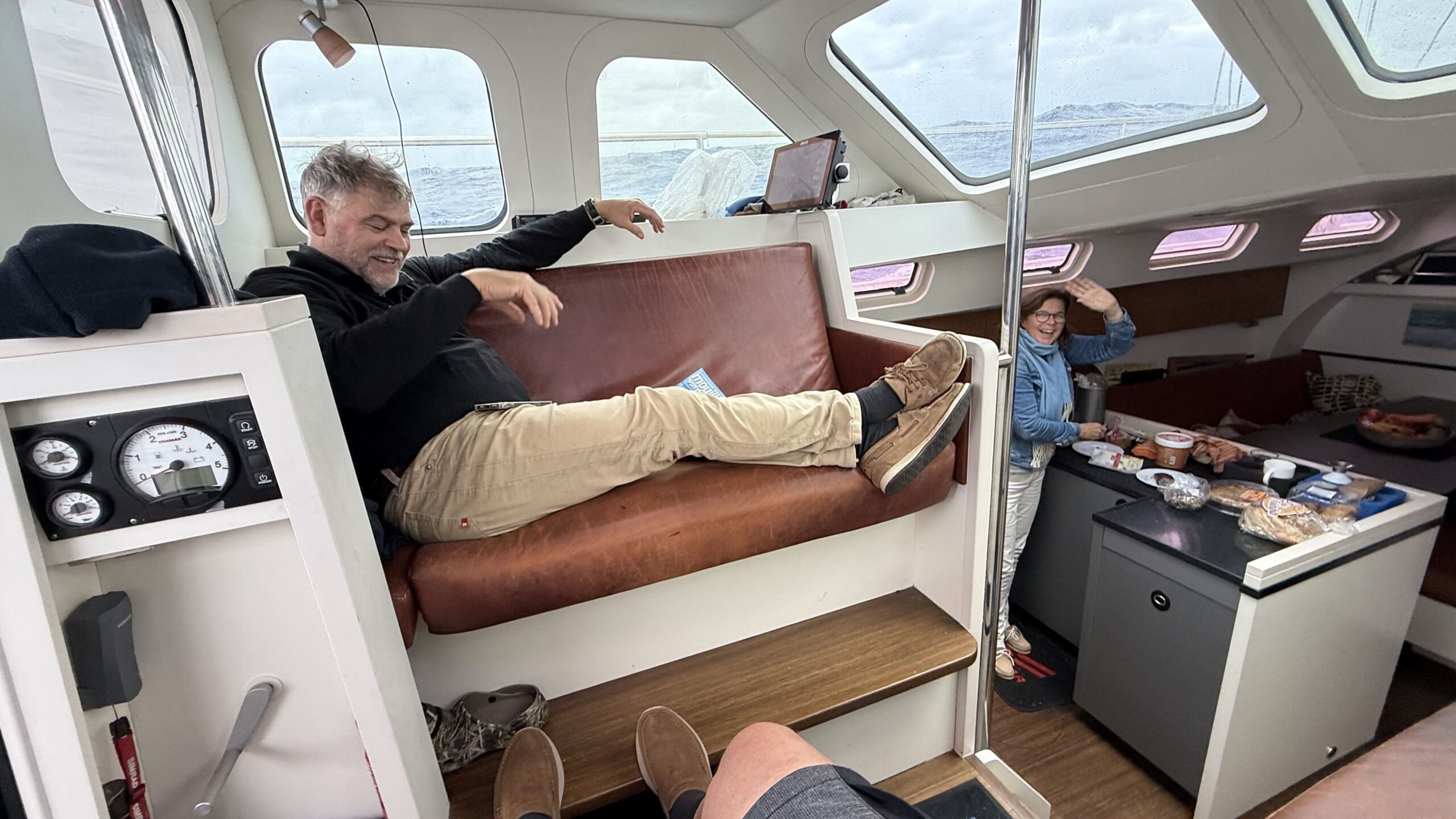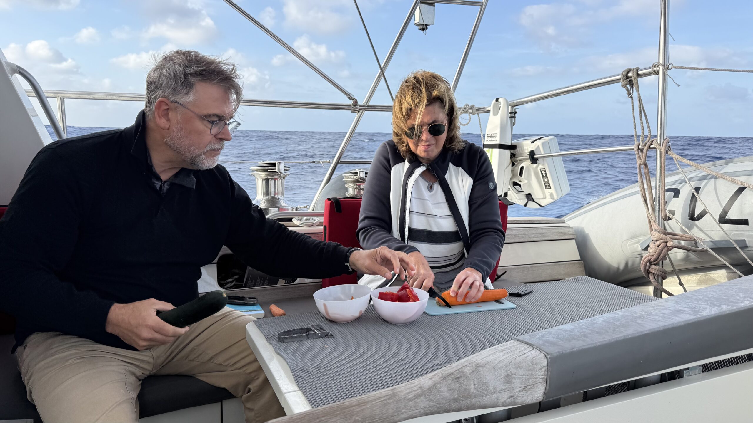Laten we beginnen waar ik gebleven was: Lissabon. Om Koen te ontvangen was ik naar Cascais gezeild. Dat is de “eerste” haven van groter Lissabon als je vanuit het noorden de hoek om komt en traditioneel dé flaneer plek voor de Lissabonezen (? Lissabonners?) en ook voor veel toeristen. Een gezellig kustplaatsje met mooie stranden, een prachtig oud centrum, veel restaurants en bars. En dus een mooie jachthaven, die alleen in de zomer mij te duur is: € 120 per nacht, daarvoor kan ik wel doorvaren naar een iets minder illuster plekje. Maar in Oktober is het winterseizoen al begonnen en is de prijs bijna gehalveerd. Koen kwam, op z’n Koens. Dus: niet de Bolt taxi pakken die ik aanbevolen had, maar met de Bolt van vliegveld naar het treinstation, en dan het kustboemeltje pakken. Hartstikke leuk voor hem, maar ik zat maar te wachten waar hij bleef. Enfin, het weerzien was heel leuk en we konden goed bijpraten. Koen heeft nogal het nodige meegemaakt in zijn leven, privé en ook in het werk. Dus het was hoog tijd om daar eens over door te bomen. Ondertussen in de weer met KM, Rob Wink (leverancier) en Schenker (fabrikant) van de watermaker, het blijkt dat er een nieuw moederbord nodig is. Na een paar dagen boodschappen halen, kleine klusjes doen en lekker uit eten kwam Saskia, zijn vrouw, ook naar Lissabon. Zij heeft er erg weinig van gezien want ze kwam na zonsondergang en de volgende ochtend vertrokken we al, vooral omdat als we zouden wachten het helemaal prut zou zijn met de wind.