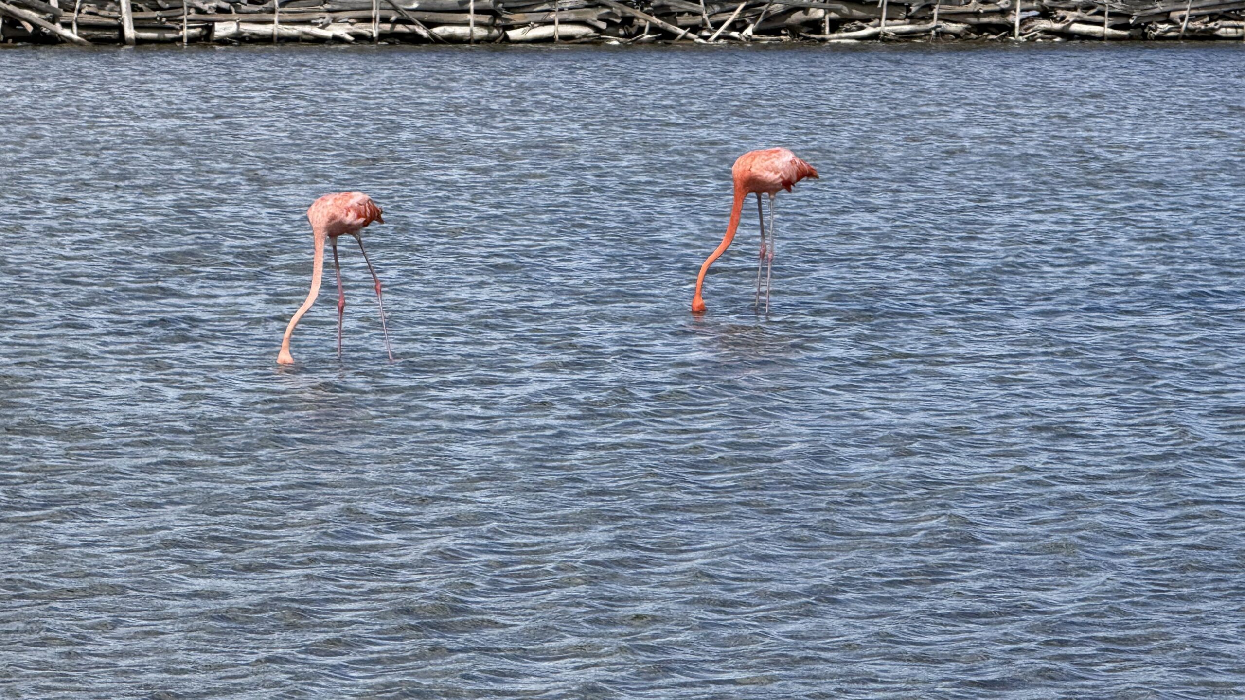 Met Arnold en Abbie konden we dus nog één dag over het eiland toeren en heb ik hun de highlights van Bonaire laten zien: recht omhoog vanaf Kralendijk, langs de dure huizen van de nieuwe nederlanders, langs de bekendste snorkel en duik sites, langs het meer in het nationale park waar we flamingos gespot hebben, langs het inheemse dorp Rincon, langs de oostkust terug naar Kralendijk en daarna een slinger langs de zuidkant: lunchen bij Sorobon, waar de (wing en gewone) surfers vlak voor je over de lagune heen en weer schieten, vervolgens via de zoutvlakten en de kust weer omhoog langs de kite surfers en via het vliegveld terug naar Kralendijk.