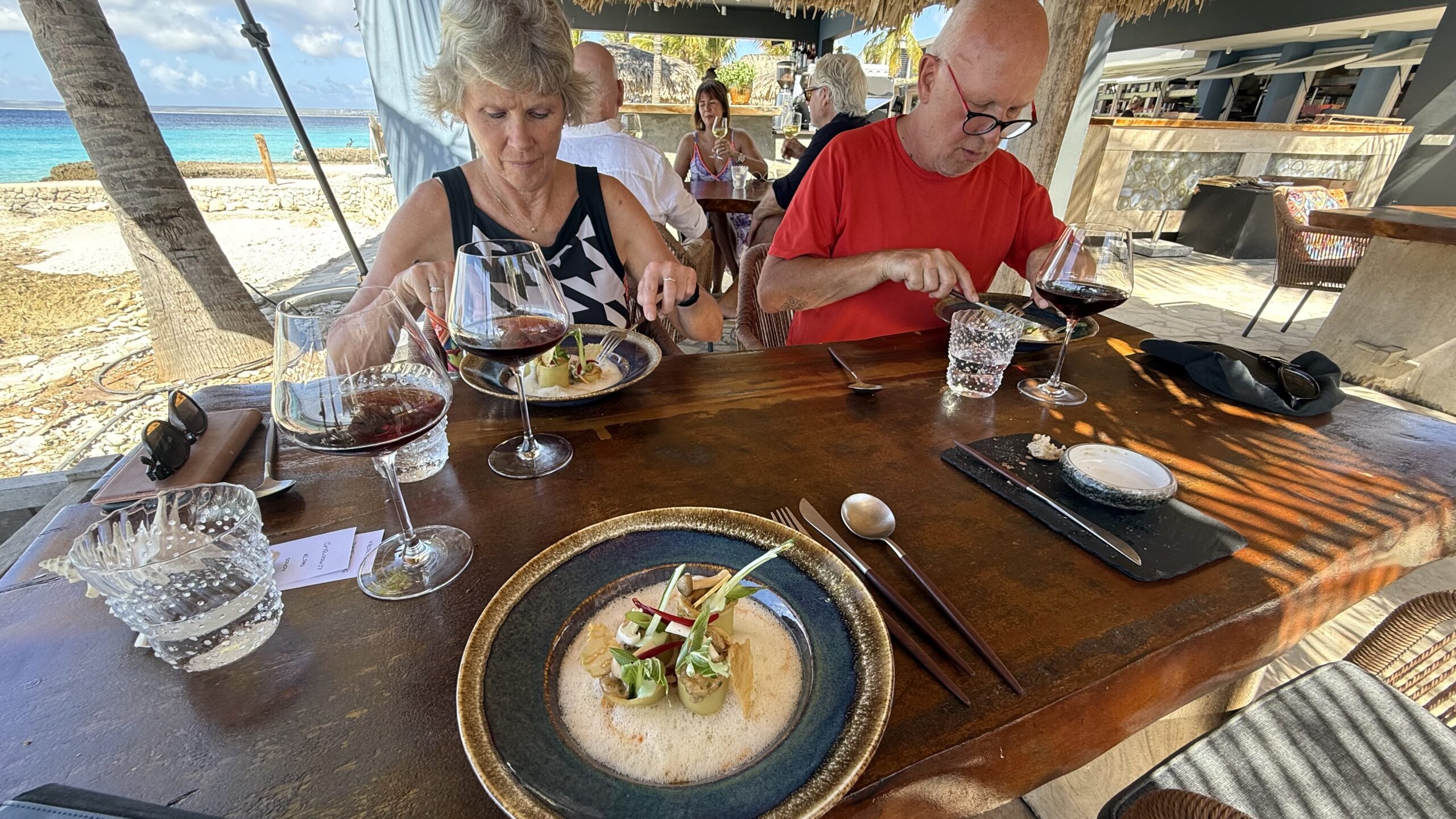 Na een paar dagen met Abbie alleen aan boord gezeten te hebben kwam Brigitte, zijn vrouw, ook aan boord. Van haar wist ik wel dat ze niet bekend was met zeilen. Geeft niet, als je het maar weet. Ik had hun de achterhut gealloceerd maar dat vond Abbie toch wel krapjes met z’n tweeën dus sliep hij maar op de bank. Na een eerste nare nacht ivm z’n zere schouder is hij andersom gaan liggen en toen was het prima. Met z’n drieën zijn we de dag nadat Brigitte arriveerde bij Brassboer gaan eten; het restaurant opgericht door de overleden Jonnie Boer. Het eten was geweldig, de bediening charmant maar op trainee niveau (eentje had het over het “brouwen” van wijn!) Wel veel wijn bij het eten dus daarna werd de rest van de dag alwéér rustig aan gedaan: beetje zwemmen en snorkelen vanaf de boot. Dat is wel het leuke van Bonaire dat je dat meteen vanaf de boot kan doen. Helaas zat er wel veel minder vis dan zes jaar geleden.