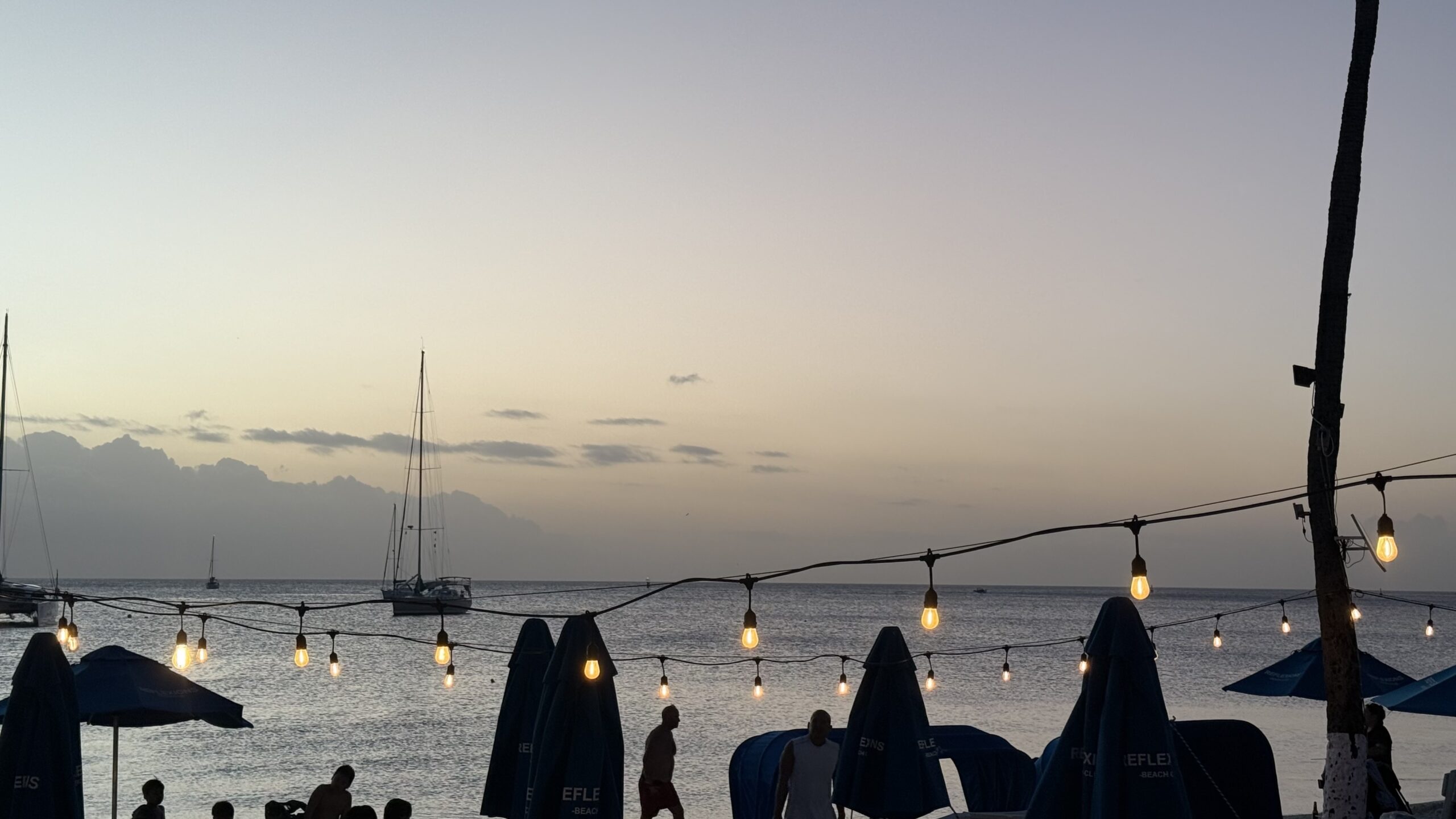 De volgende dag werd de laatste dat Abbie en Brigitte aan boord doorbrachten, als landrotten lokte een appartementje op de vaste wal toch net iets te veel. Om er het meeste van te maken had ik bedacht ze dan het toeristengebied aan de west kant van het eiland te laten zien; prachtige zandstranden en lage hotels voor de Europeanen en wilde watersporten zoals jetskis, paragliden en “high rise” hotels voor de Amerikanen met daar omheen openbare strandjes. Leuk om weer te zien, maar toch maar terug naar de Paardenbaai waar de barretjes weliswaar ook toeristisch zijn maar niet zo doorgeschoten. In anderhalf uur langs gemotord en onder fok in 30 minuten weer terug.